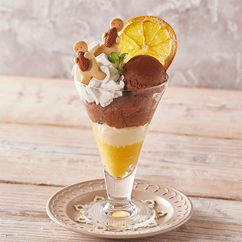 - パフェグラスに、下から順にオレンジゼリー・バニラアイスクリーム・ふんわりチョコムースの順に盛り付けます。