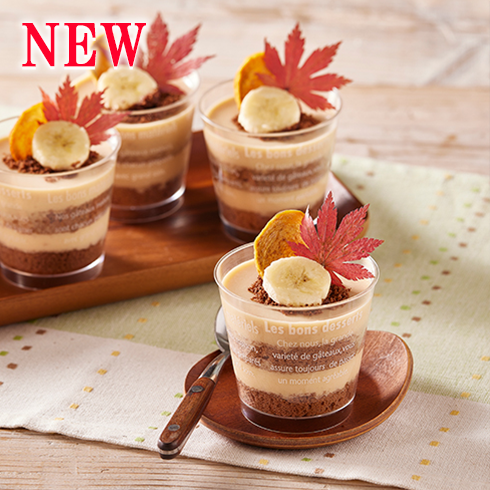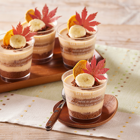 - カップに直径5.1cmにくりぬいたココアスポンジを敷き、5.を45g流し入れます。その上に直径6cmにくりぬいたココアスポンジをのせ、さらに5.を45g流し入れます。(残り4個分も同様に組み立てます)