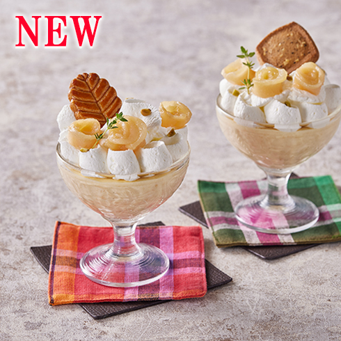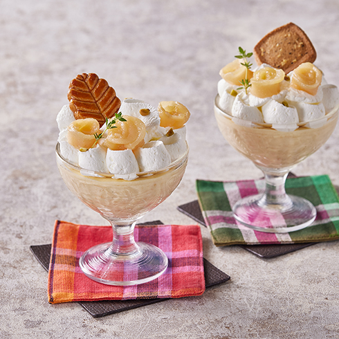 - 薄切りにした洋なしで小花を12個作り(4g/個)、グラスに3個ずつ飾ります。