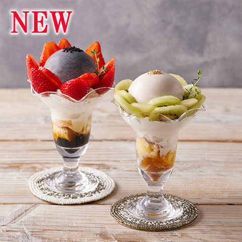 - パフェグラスの底に黒ごま(または白ごま)ミルクソースを入れ、グラスを回して側面にソースをつけます。