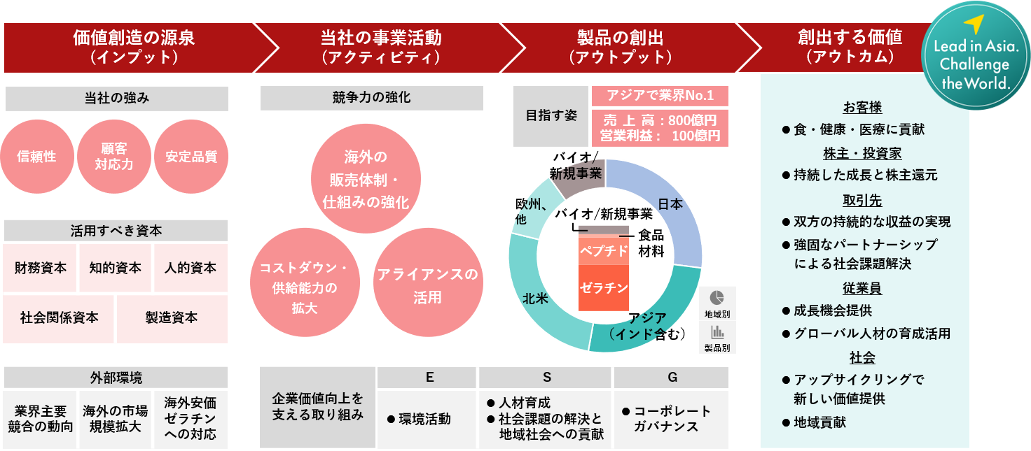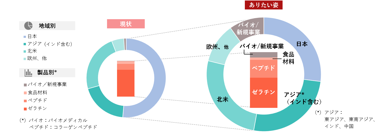 ・製品別ポートフォリオ:引き続き成長が見込まれるゼラチンとコラーゲンペプチドを成長の柱とします。加えて、バイオメディカルや新規事業を大きく成長させます。