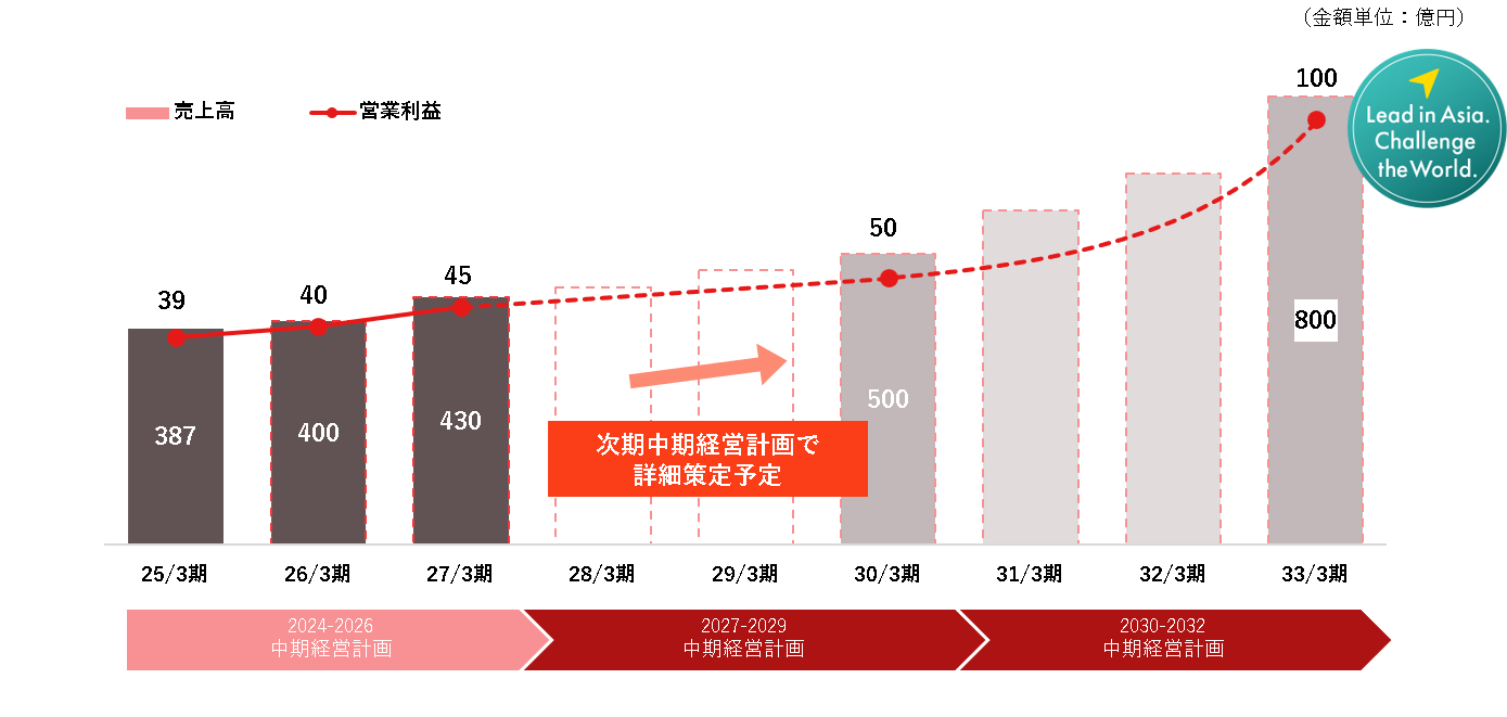2033年3月期に売上高800億円、営業利益100億円という従来にない飛躍的な成長を目指します。