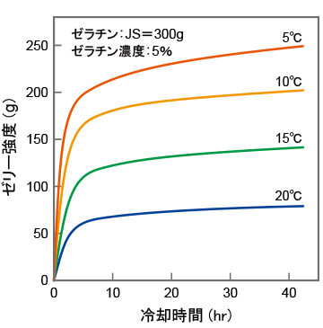 <図7-1-3>はJS=150~300g(ゼリー強度:JIS K6503)の 5%ゼラチン溶液を、5~20℃で冷却したときのゼリー強度の経時変化です。いずれの温度でも、冷却開始後 1~5時間でゼリー強度が急激に上昇し、それ以降もゆるやかではあるが上昇を続けています。これは時間とともにゼラチン分子が構成するゲルネットワークが増え、その構造もより強固で安定的になることが要因といわれています。なお、<図7-1-3~5>に示したゼリー強度も、JIS K6503 に準じた「ゼリー表面を2分の1インチ(12.7mm)径のプランジャーで 4mm 押し下げる」荷重を表わしています。